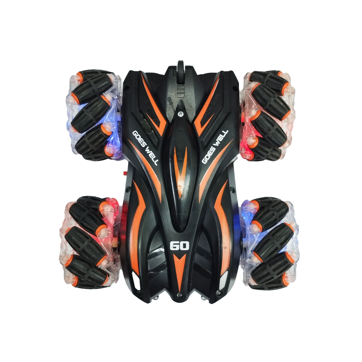 Gracias a su diseño doble cara y ruedas especiales, puede girar, voltearse y seguir avanzando sin detenerse. Sus luces LED, combinadas con efectos de sonido, convierten cualquier espacio en una pista de acción.