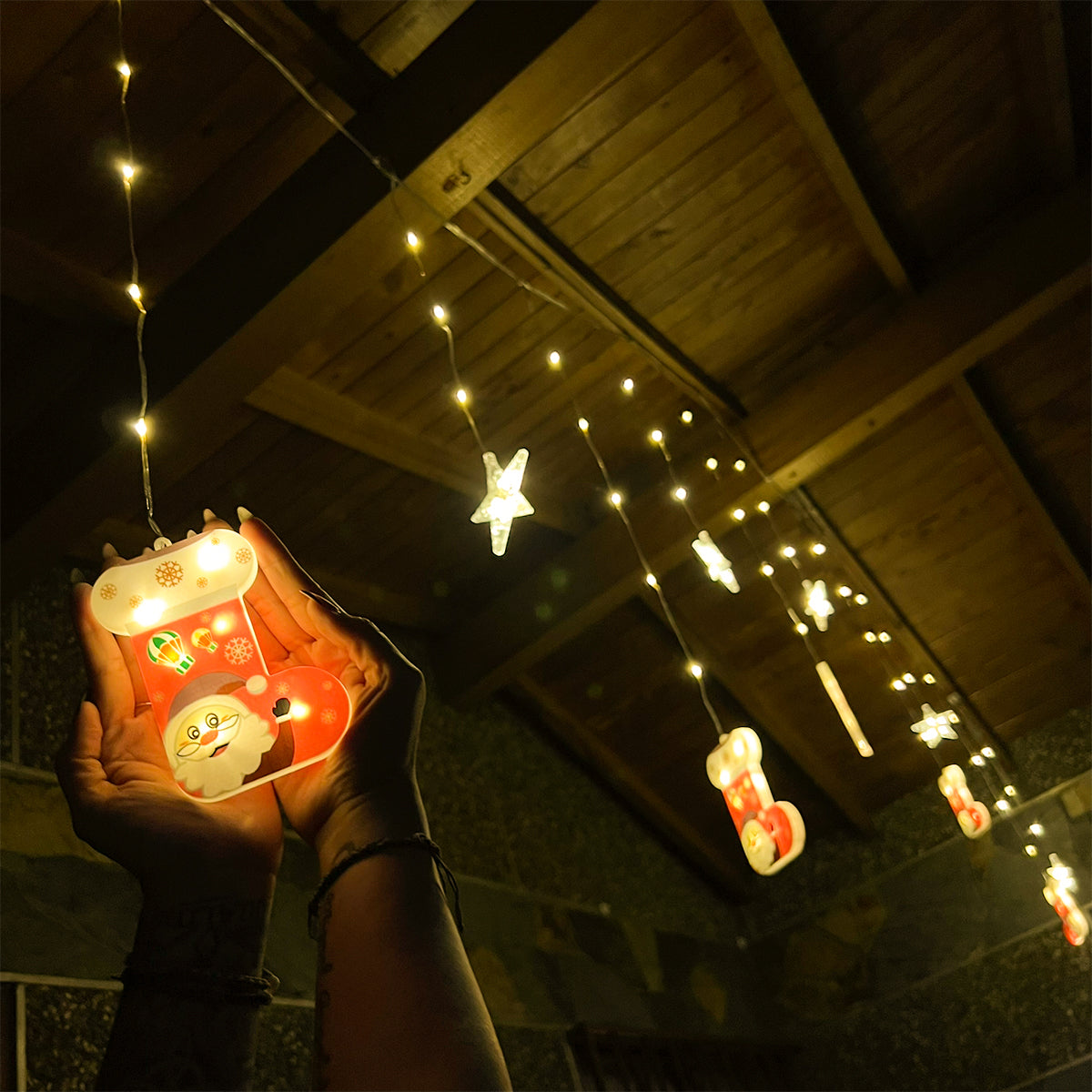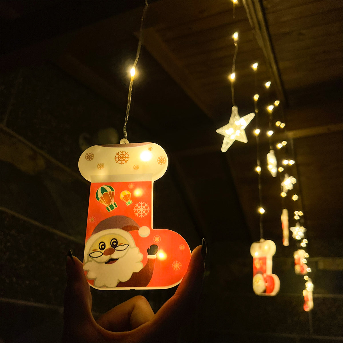 Cada figura es translúcida y facetada para dispersar la luz LED de manera uniforme, creando destellos que elevan la estética del espacio. Esta cascada es ideal para decorar techos, balcones, ventanas, corredores, salones o incluso la entrada de tu hogar, aportando un estilo moderno, dulce y festivo.