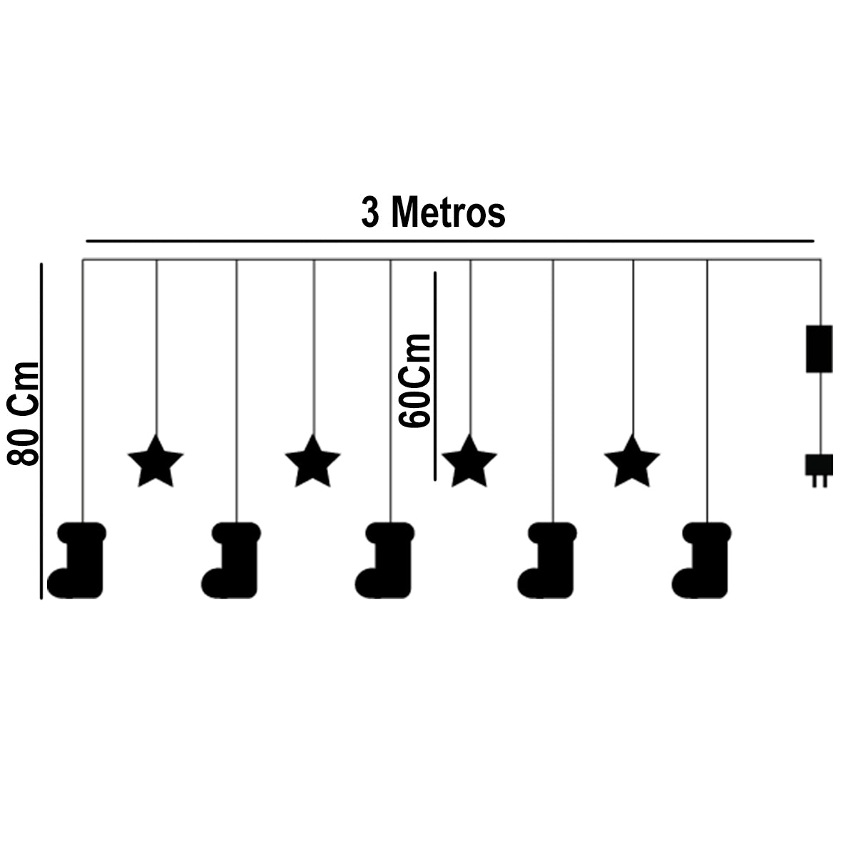 - Tamaño Aprox.: Largo: 3 m / Cantidad de tiras: 10 tiras / Caída de la tira: Larga: 80 cm - Corta: 60 cm / Cantidad de luces: 100 LEDS.