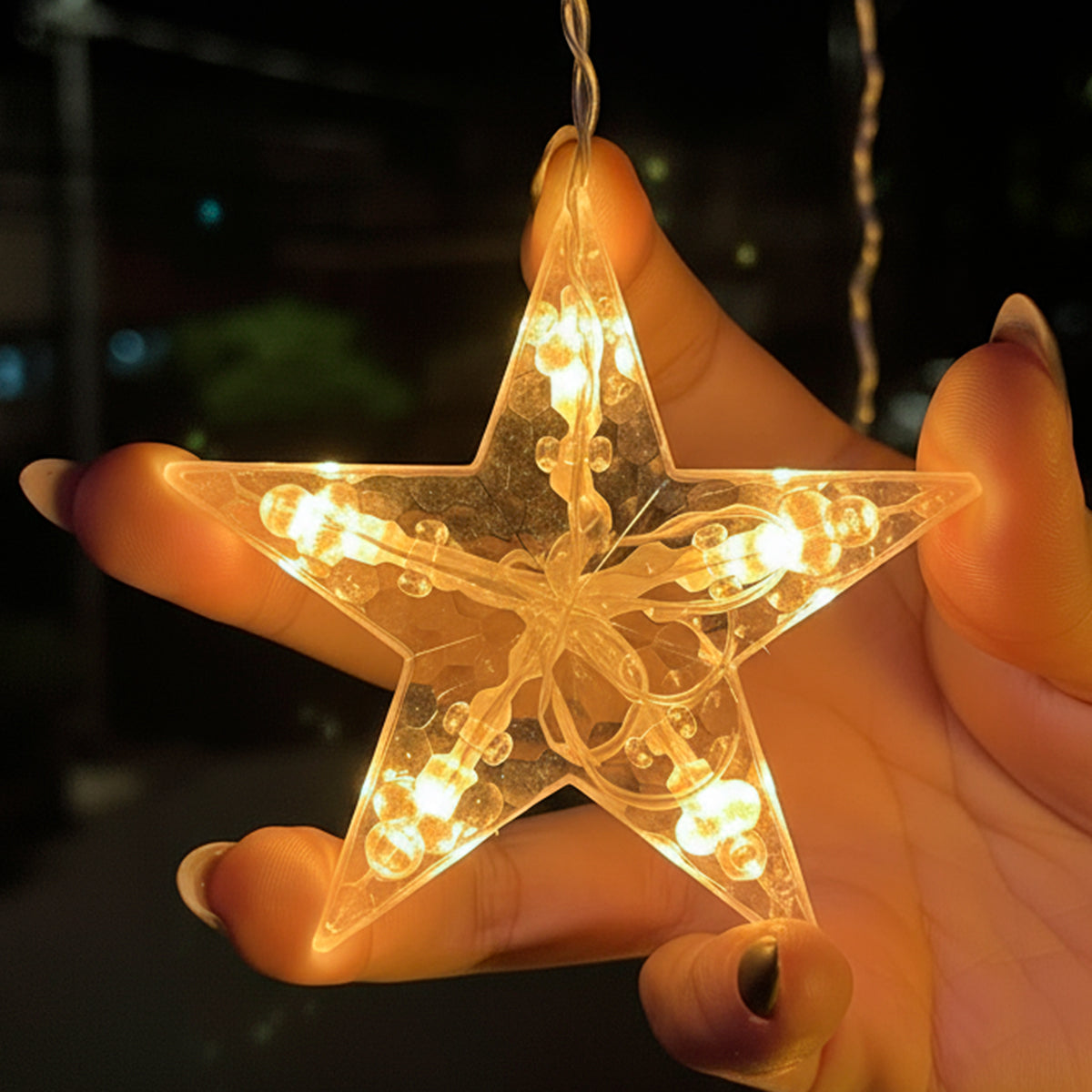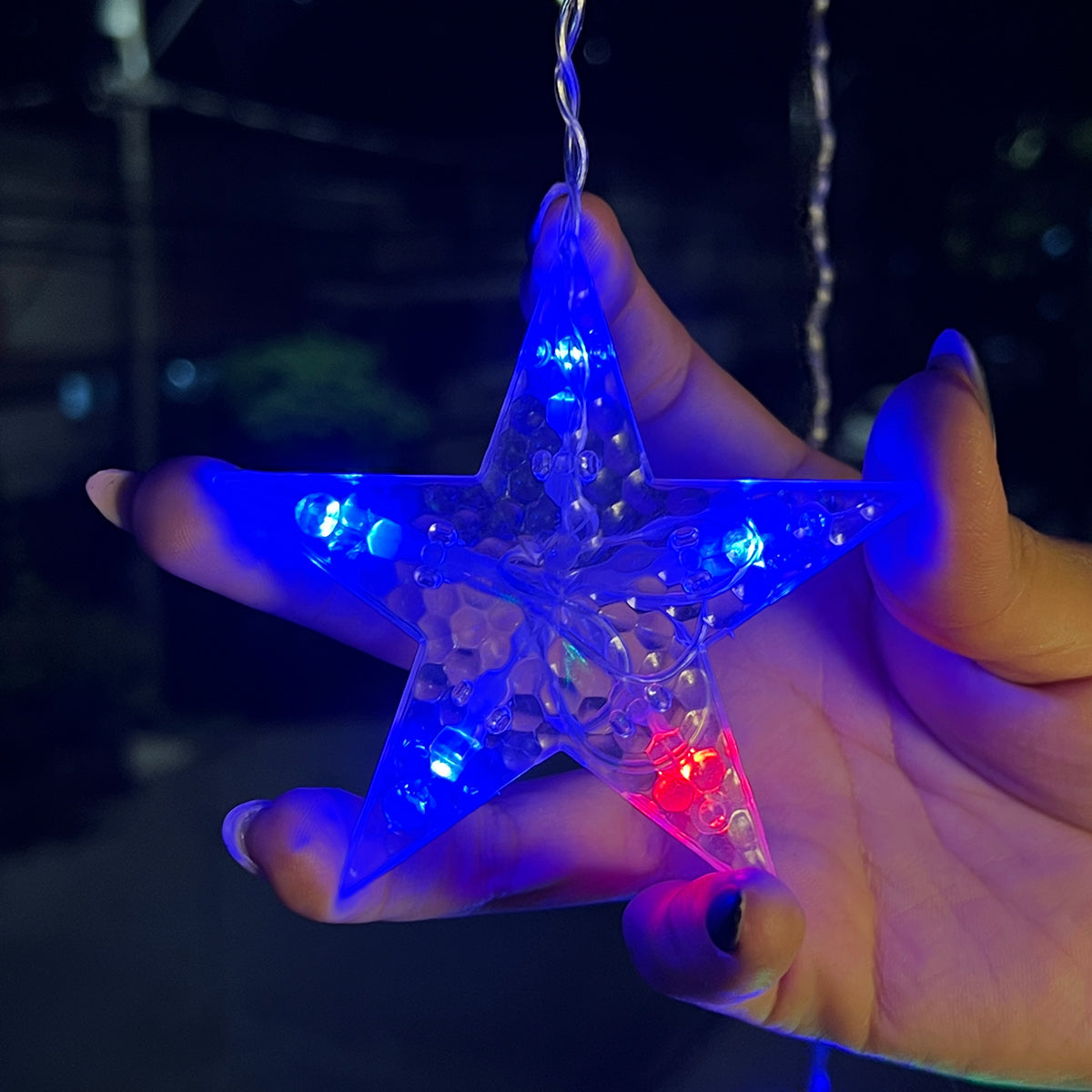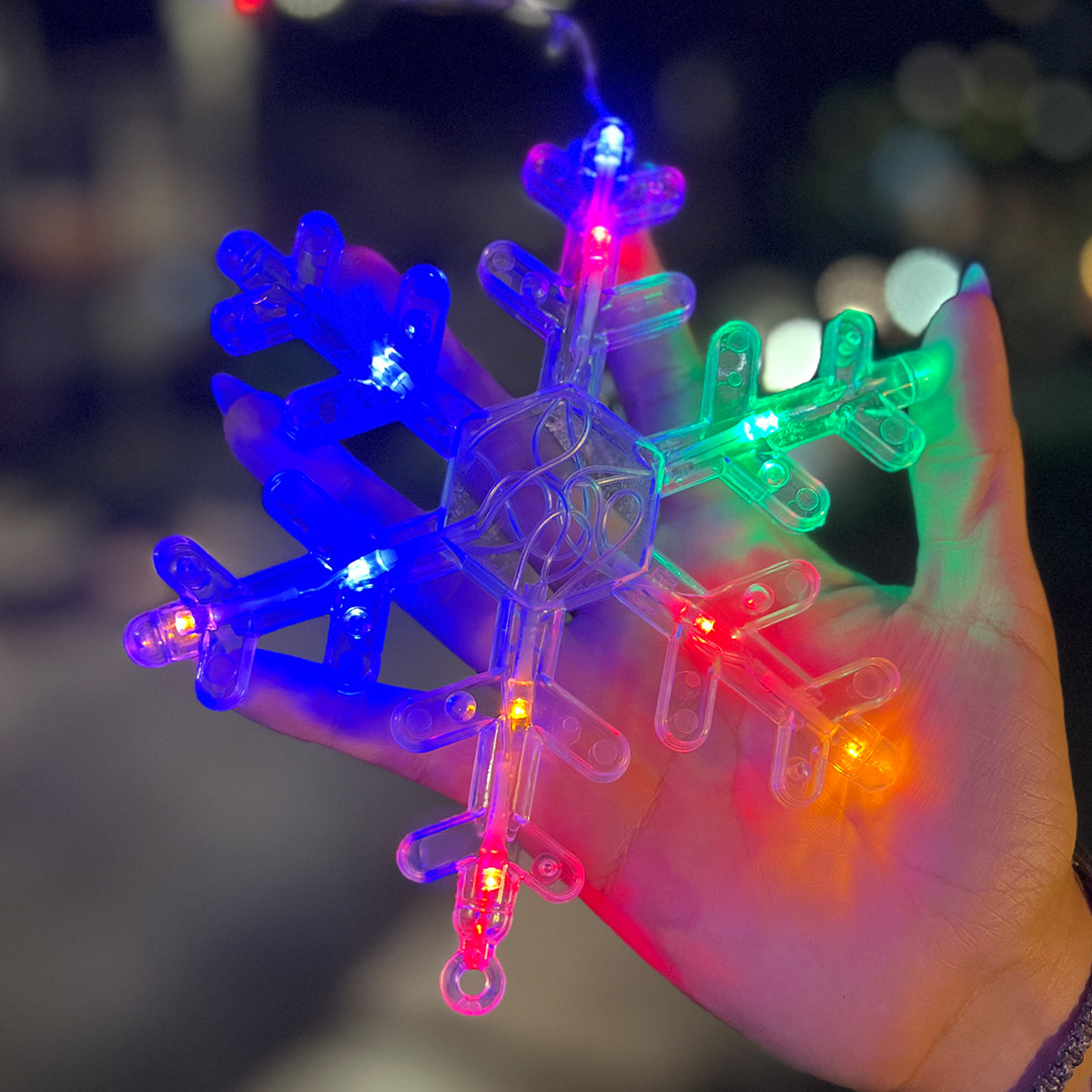 - 🌈 Cortina de luces LED colgantes multicolor con figuras de estrellas y copos de nieve.