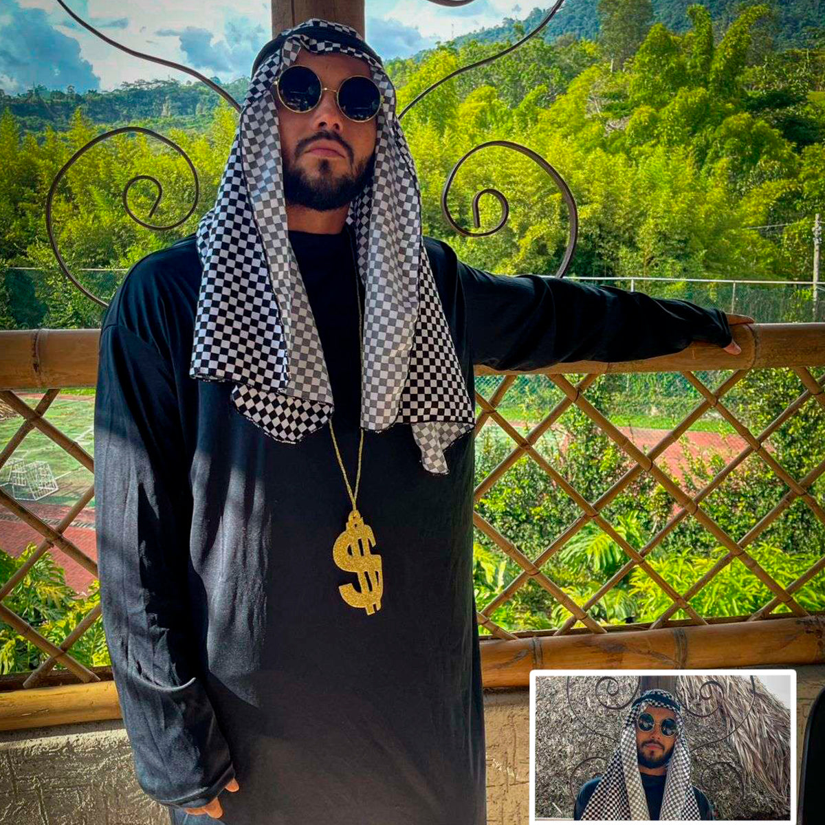 - 👳 Incluye pañuelo tradicional: estampado en cuadros que completa el look de jeque con gran realismo.