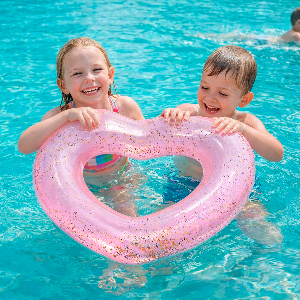 El flotador inflable en forma de corazón es ideal para que los niños disfruten del agua de manera divertida, cómoda y visualmente encantadora. Su diseño transparente con glitter lo hace irresistible para juegos, fotos y tardes de verano.