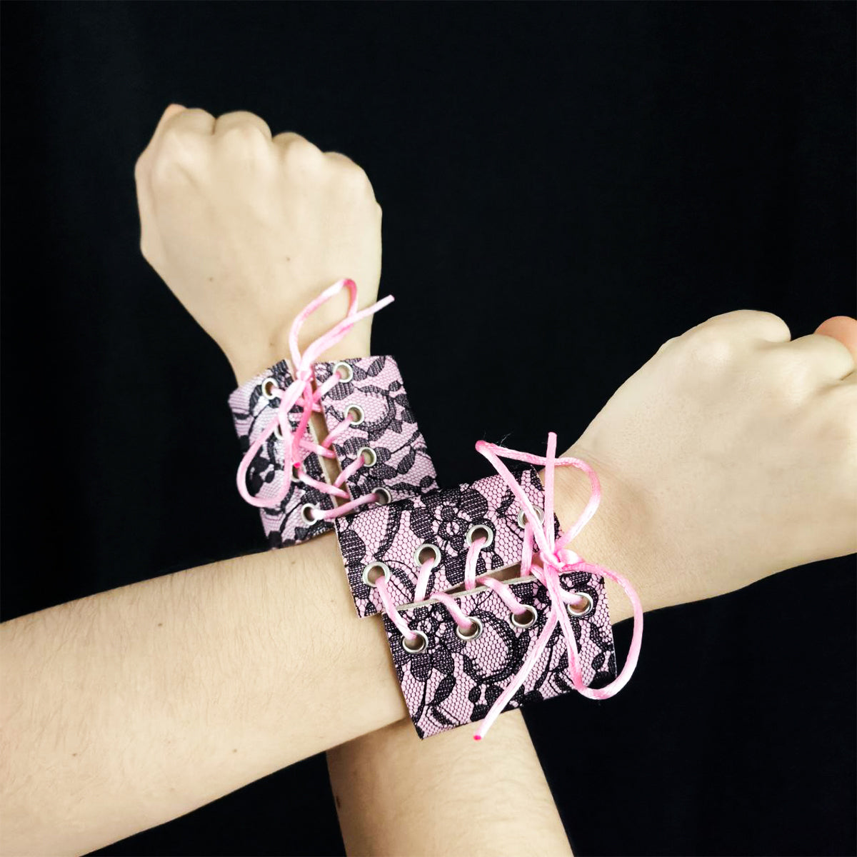 - 2 muñequeras decorativas con encaje y cinta rosa.