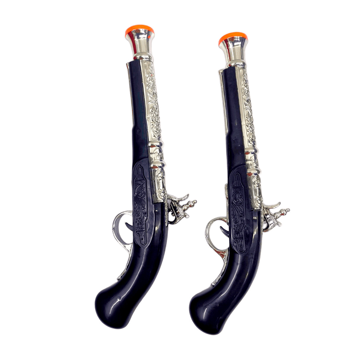 - 🔫 Pistolas de diseño clásico plateado y mango negro.