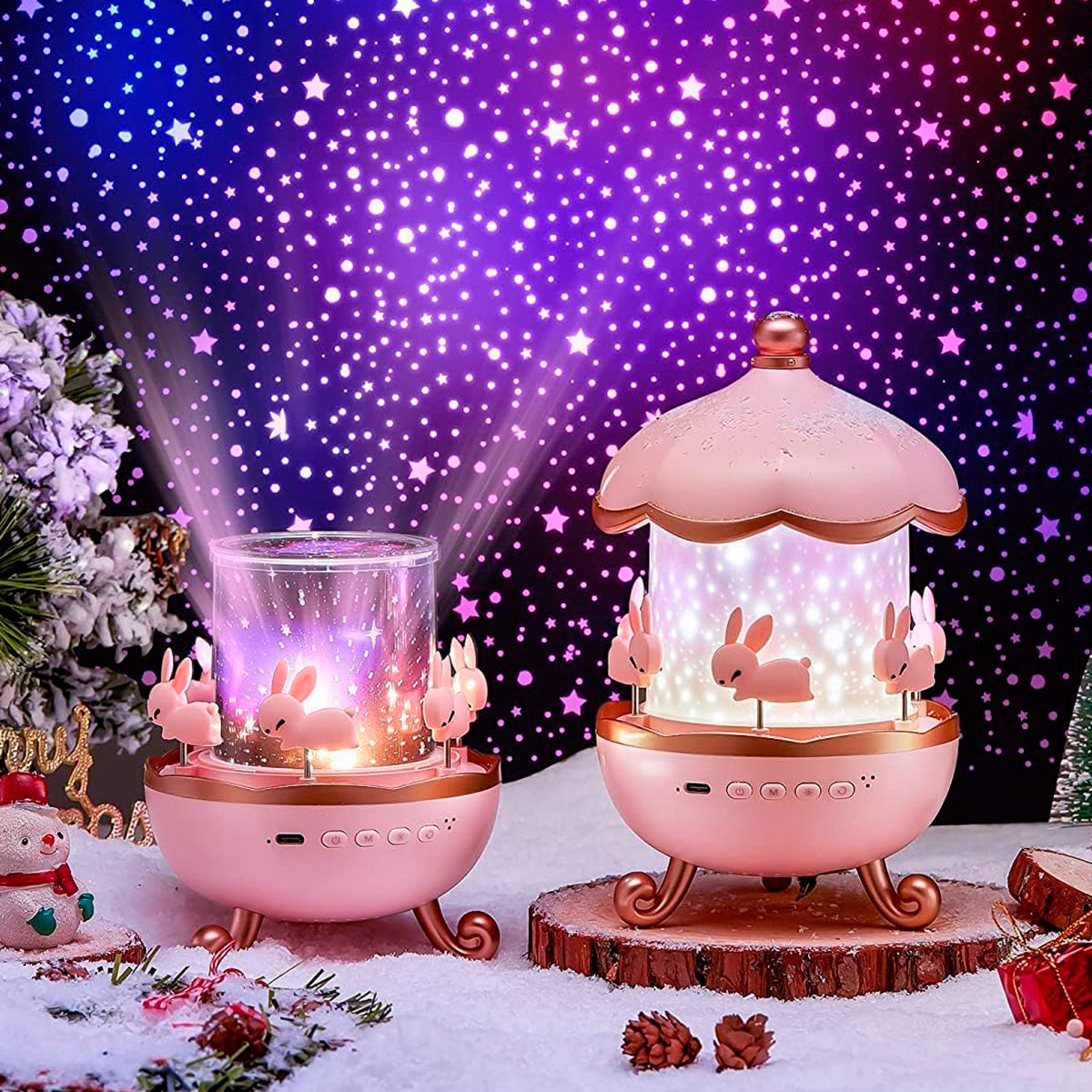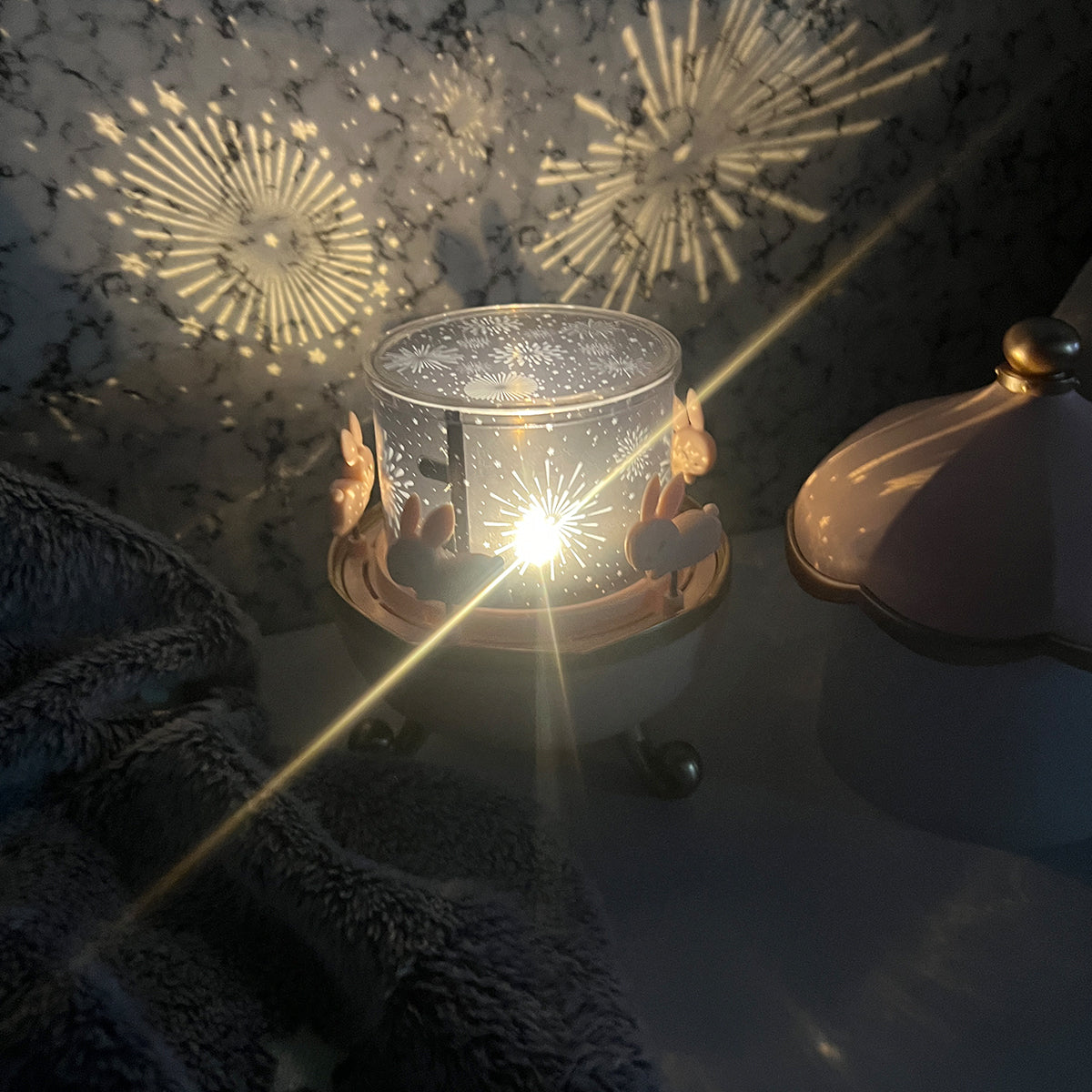 Incluye láminas temáticas como océano, universo, cumpleaños y más, para crear ambientes únicos cada noche. - 🐰 Diseño tierno con conejitos