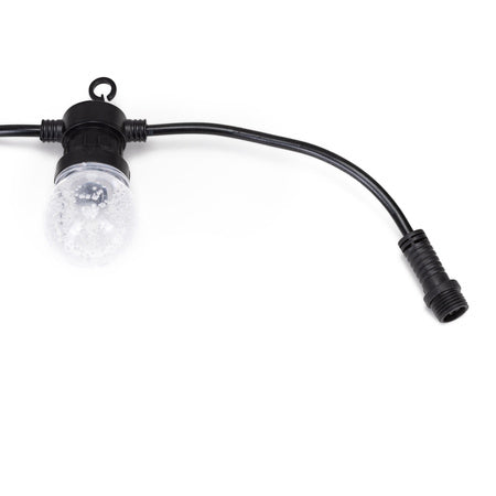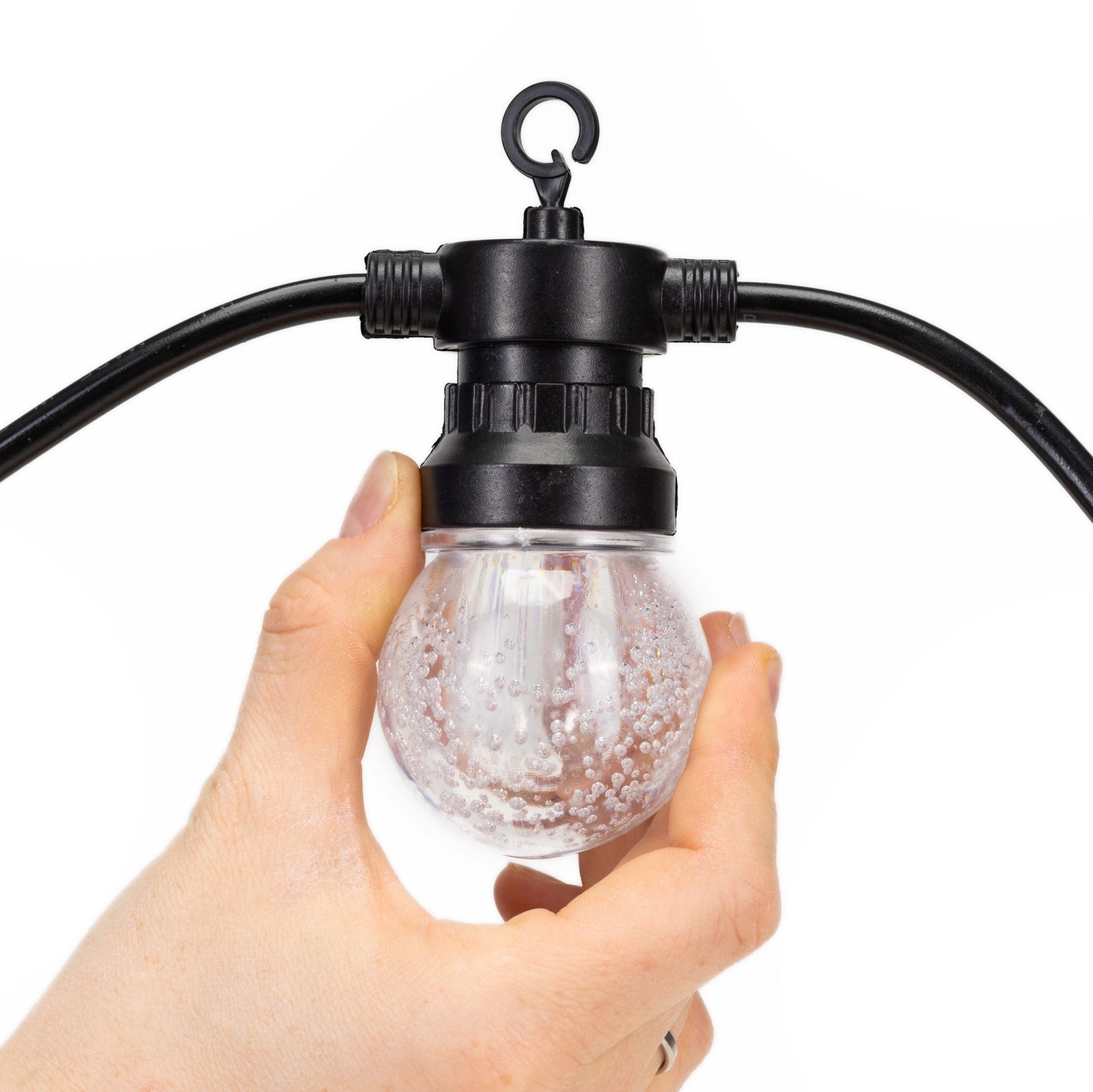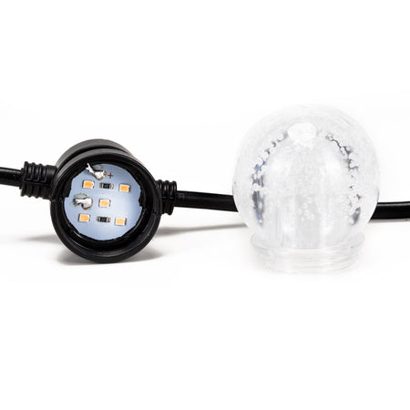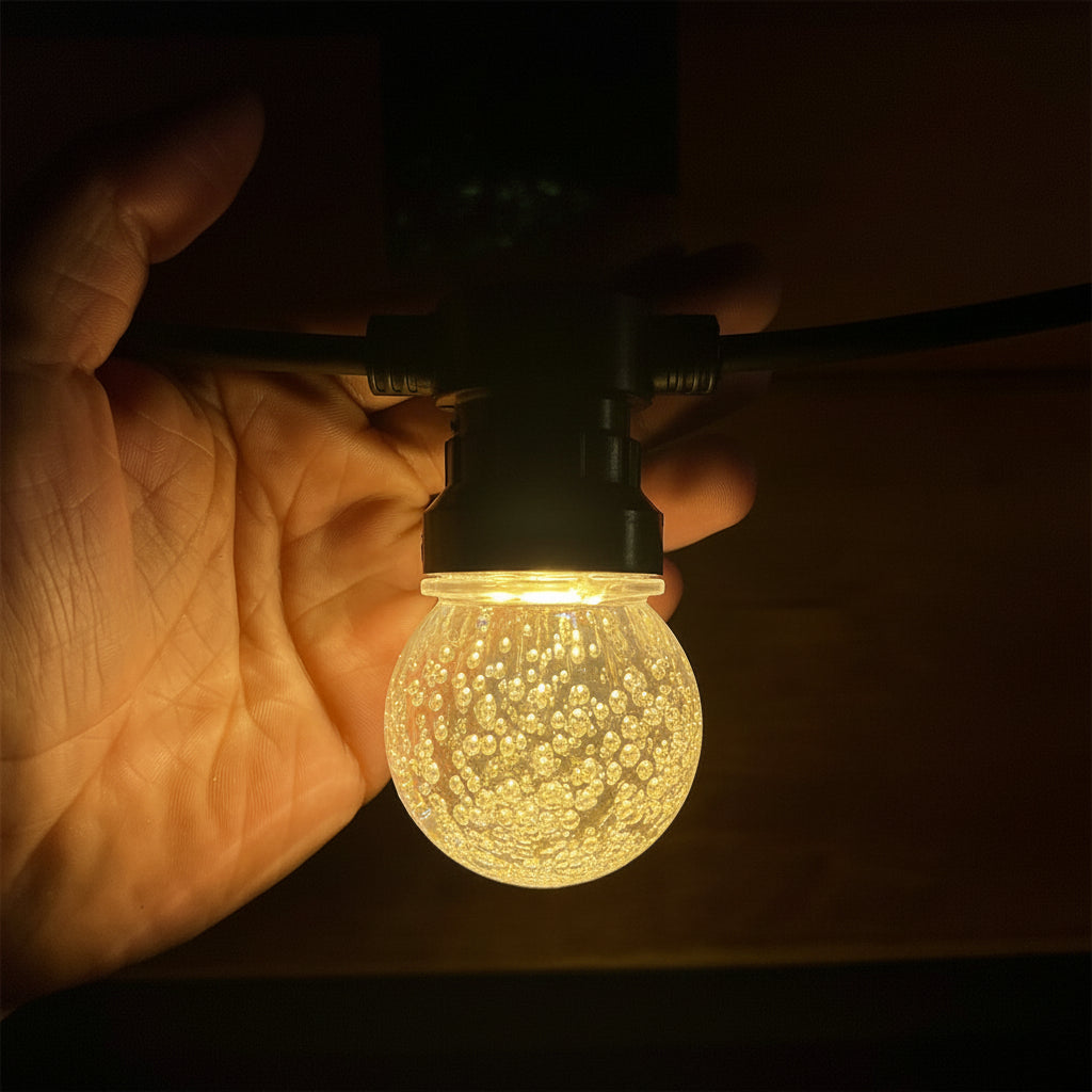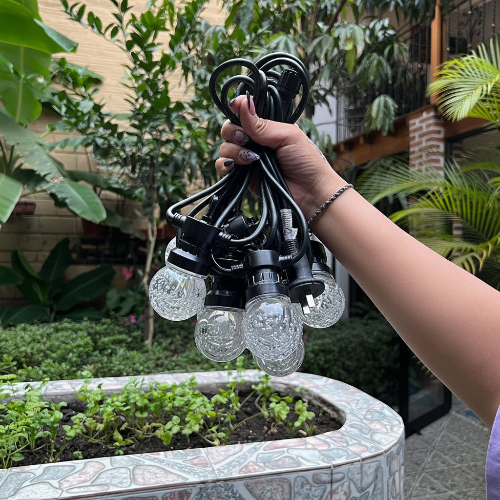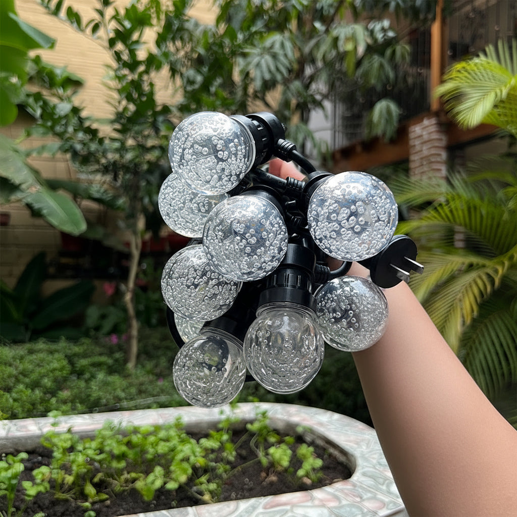 Cada bombillo es una esfera transparente que reflejan la luz, generando un efecto similar al de pequeñas bolas de cristal luminosas. Su diseño versátil la hace ideal tanto para decoración navideña como para uso durante todo el año, en terrazas, balcones, habitaciones o locales comerciales.