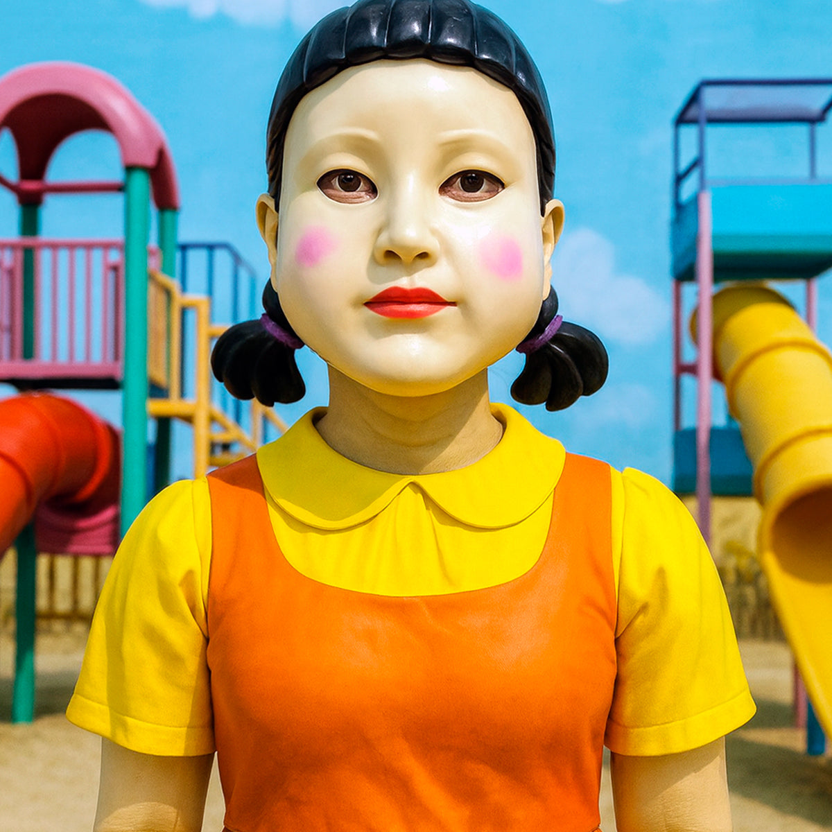- 🧩 Diseño realista que recrea a la icónica muñeca del reto “luz roja, luz verde”