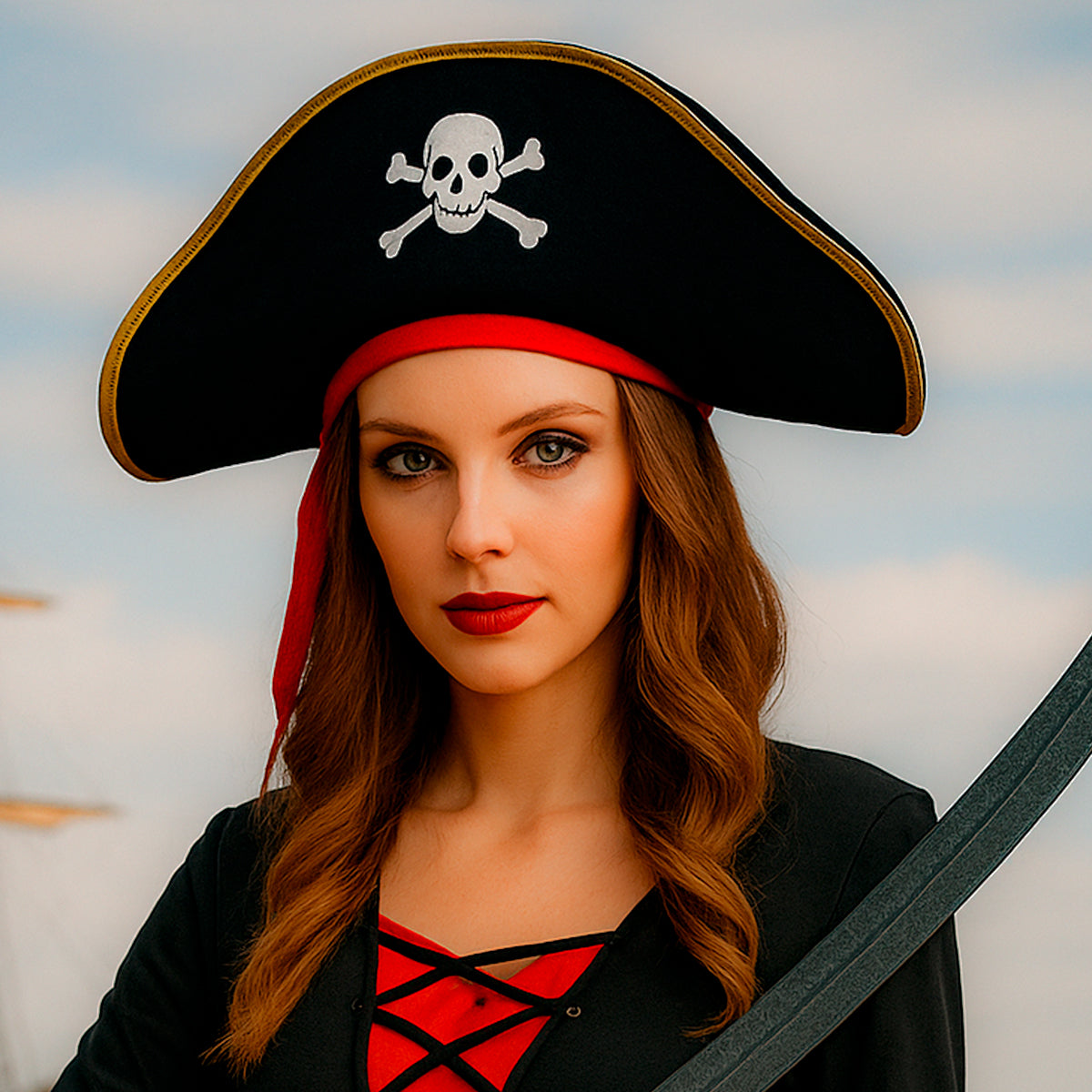 Sombrero pirata clásico ⚓🏴☠️ para niños y adultos. Diseño con calavera, borde dorado y pañuelo rojo.