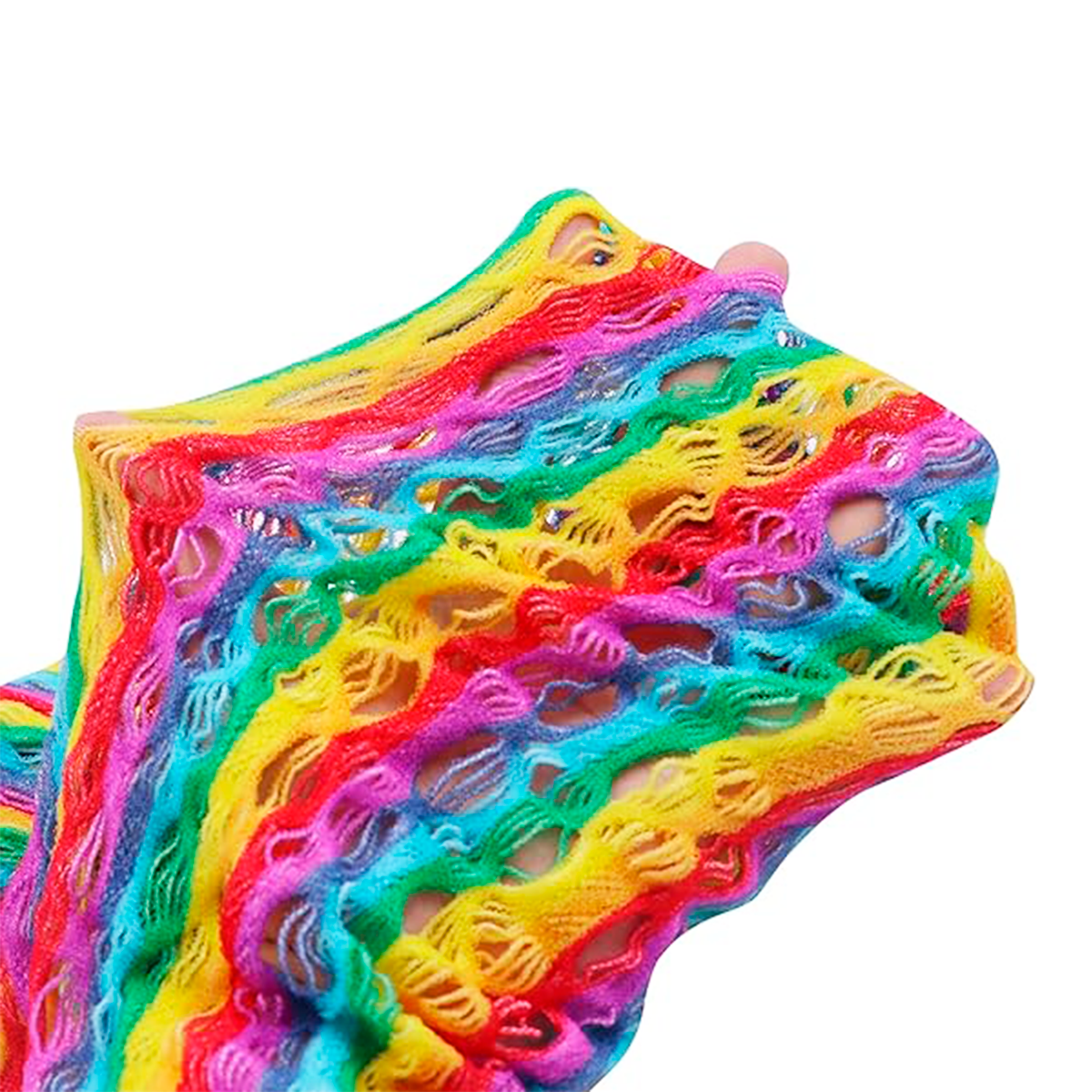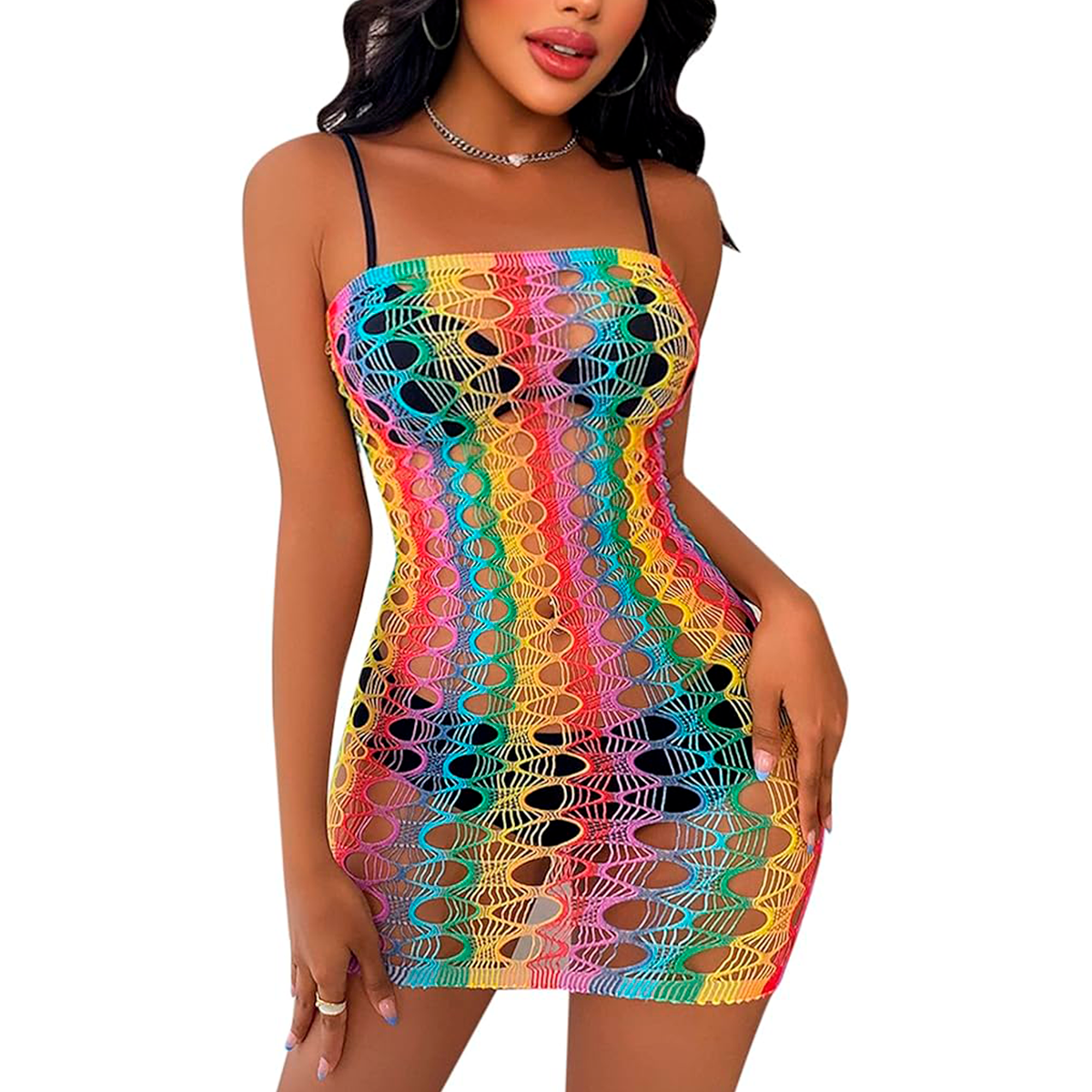 Luce atrevida, fresca y llena de estilo con el traje de malla arcoíris. Perfecto para usar como salida de baño, outfit de festival o body sexy para tus mejores fotos. Un look vibrante y cómodo que te hará destacar en cualquier lugar.